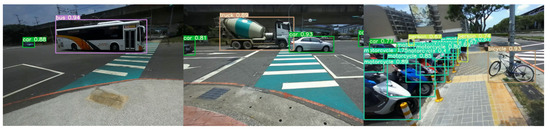 However, obstacles still may appear on the walking way when the visually impaired user is under the guidance of our assistive system. It should be detected further to prevent the user from danger. Compared with the white cane, the proposed system has the capability of identifying the obstacles. In this work, the frequently-used object detection, namely YOLOv5 [25], is adopted to perform obstacle detection and recognition. Since YOLOv5 has the advantages of lightweight and real-time computation. Especially the size of the YOLOv5s model is 27 MB, which is much smaller than the 245 MB of YOLOv4. Here, considering the most common objects on the road, we pre-determine six categories of objects, including the motorcycle, bicycle, person, car, truck, and bus, that must be detected. The training data for the YOLOv5s comes from a part of the COCO dataset [26] and the street-view captures near Taoyuan High-Speed Rail station, Taiwan. The distribution of our dataset is shown in Table 5. We used 10,000 images from a part of the COCO dataset as training data, and the other 3122 images were collected by ourselves, in which 2534 images were added into the training set, and the other 588 images were used for validation. The last column denotes the label count for each specific object. For instance, 38,095 “person” labels mean that some pictures have multiple objects labeled “person,” so that there are 38,095 “person” labels in the entirety of the 12,534 images. There was no data augmentation during the training stage because the number of samples in the training data was sufficient.