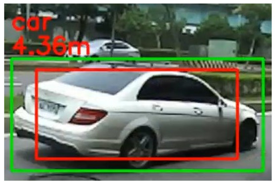 Table 6 shows the data and parameters used in network training. Table 7 shows the object detection results by YOLOv5s, where AP50:95 in the first column takes values from 0.5 to 0.95, and the best results occur when the value is 0.5. The output of YOLOv5s is a bounding box in which the object can be identified. For instance, the bounding boxes shown in Figure 9 are obtained from YOLOv5s, and the number at the top of each bounding box is the confidence value for the object identification. Further, the distance between the user and the object is obtained from the ZED 2. Let the bounding box obtained from YOLOv5s be cropped to 64% of the original box size by shrinking each side of the box by 10% (see Figure 10). We took the median of all those pixel depths in the cropped box as the object’s distance ahead of the user.