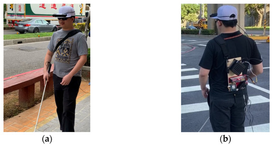 The whole assistive system is wearable and contains an embedded device—Jetson AGX Xavier launched by Nvidia [22], a binocular camera named ZED 2. Additionally, a voice prompt manager is installed in the AGX. This work connects a sound card between the AGX and the headphone to produce voice prompts. The AGX featuring a Tegra System on Chip (Xavier SoC) comprises 8 NVIDIA Carmel CPU Cores (architecture compatible with ARMv8.2) and an integrated GPU based on the NVIDIA Volta architecture with 512 CUDA cores. In addition, it also adds a Tensor Core, an NVIDIA deep learning accelerator, a VLIW (Very long instruction word) video processor, and an image signal processor (ISP) to enhance AI computing performance. The ZED 2 is a stereoscopic camera designed for tracking vehicles and people with a vast field of view. It offers a more excellent depth detection with a 120-degree wide-angle field of view. These functions provide a great sense of safety to visually impaired people. The aim here is to combine depth-of-field detection (up to 20 m) with object detection. The whole assistive system is shown in Figure 1, powered by a lithium battery with a capacity of 5200 mAh (Figure 1a). The battery with fully charged (16.8V) can supply the system operation time of about 2.5 h. The battery and AGX are installed on the backboard of the user. The ZED 2 is fixed on the brim of the user’s cap (see Figure 1b). Moreover, the headset is connected to the sound card, and the voice instruction will be output to the user.