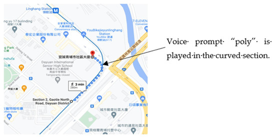 We took 3–4 h for one experiment with a visually impaired person. It may have at least 7 or 8 rounds in an experiment. The walking path for an experiment was about 300~1200 m and must include sidewalks and crosswalks. We performed the experiments with three different paths, but those paths were all around the MRT station. Moreover, even though we used the same path, we might put different obstacles in front of the user in different positions. Here, one of the results is shown at the link: https://www.youtube.com/watch?v=G5QkhQY7h5M (accessed on 24 October 2021) in which the voice prompts are “right,” “left,” “slightly left,” “slightly right,” “go straight,” and “poly.” The prompt “poly” is played when the user is arriving at a specific point in the planned route, and the prompt “poly” always appears at the curved section (see Figure 13). In the middle of the video, the visually impaired person traversed a street by walking on a crosswalk without a traffic light. In Taiwan, a company called International Integrated Systems, Inc. has a traffic light platform, “Invignal,” [27] to provide the traffic light status and timing for each intersection in northern Taiwan. However, the experiment using the platform “Invignal” is still in progress. We will publish the study result if we have a more stable experiment result in the future.