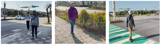 We have to admit that we did not invite enough visually impaired persons to do the experiments since it is hard to find a large number of visually impaired people to test in a short time in Taiwan. However, we have to supplement that before we invited the natural visually impaired person to experiment one time, we would request several (about 5–6) students in my lab wear blindfolds to do many experiments in advance (see Figure 14). This paper just provides a prototype of the assistive system for visually impaired people and proposes a preliminary result for helping the visually impaired. We will continue finding more visually impaired users to experiment with verifying the effectiveness of the proposed system.