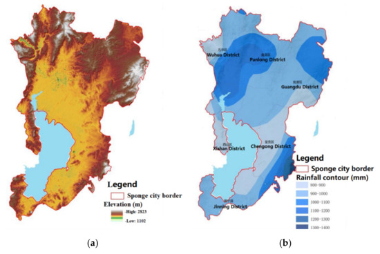 Map showing: (a) the elevation, and (b) the rainfall distribution in Kunming (adapted from Ref. [39]).