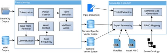 The first step in our preprocessing procedure is to generate two dictionaries: one for general English language usage and one for domain-specific usage. For the general language dictionary, we have used the Wikipedia Corpus []. For the domain specific dictionary, we used twelve textbooks related to the following areas of smart city: governance, sustainability, information technology, urban development, principles, applications, and solutions. For both indexes, we have processed the document using natural language techniques to match the word form from the documents to be analyzed. Among these operations, we have used tokenization, stop word removal, lemmatization, and part of speech extraction. These operations will be further explained in Section 3.2.