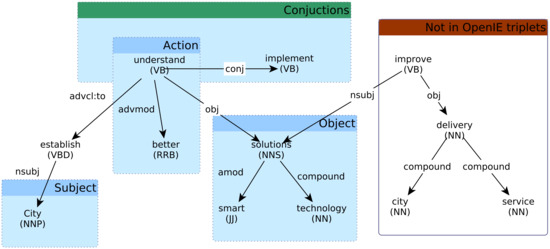 Further we look at conjunctions that we find in the text. For example, the terms “understand” and “implement” are connected by the conjunction “and”. For each of the terms connected by a conjunction we will add a new triplet. One example of such new addition is triplet 2.3 (“city implement solution”) in Table 2.