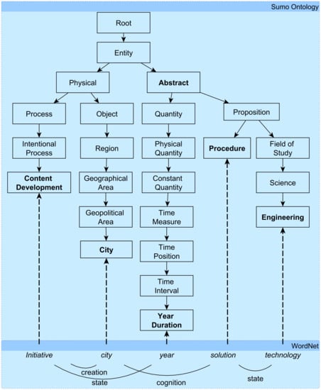 The open and complex nature of the problem necessitates knowledge elicitation methodologies that promote holistic view for evaluating multi-level initiatives and policies [,]. Formalized semantic networks provides means to structurally represent text []. These formalized semantic networks can form a holistic view of knowledge which decision makers and analysts at different levels of administrations can utilize to analyze information. However, generating a formalized semantic network is challenging due to the complexity, ambiguity, and variability of text. Ontologies provide conceptual models of a domain and can be used to reduce complexity and ambiguity in text []. Ontologies along with semantic networks can be utilized to construct a formalized semantic network which can be used in automatic semantic evaluation of text. Formal ontologies are also useful in information comprehension especially where the models generated are too large for the analyst to manage or understand. It can reduce text complexity in the area of planning [] by simplifying and abstracting the text. This abstraction can be applied to complex and adaptive systems in which human knowledge and technologies are interacting [], such as the area of smart cities. This can be accomplished by revealing the main concepts that are used in a text that experts can use to determine and understand the underlying issues existent in the text and hint to possible solutions to address them.