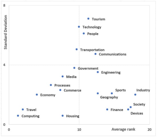 Finally we compared how the three documents address each smart city area comparatively. The results are shown in Figure 8. In this figure, the lower left quadrant shows the high ranked low variation smart city areas. The right bottom quadrant shows areas that are consistently ranked low according to their relevance while the two top quadrants show areas that are ranked differently across the documents. As seen from this quadrant, Computing and Travel are consistently ranked high in all three documents. The Society area is consistently ranked low in all three documents. On the other side of the spectrum, the Tourism shows the highest variation in relevance, with the highest relevance in the USC from UN document and the lowest relevance in the Philadelphia Smart City Roadmap document.