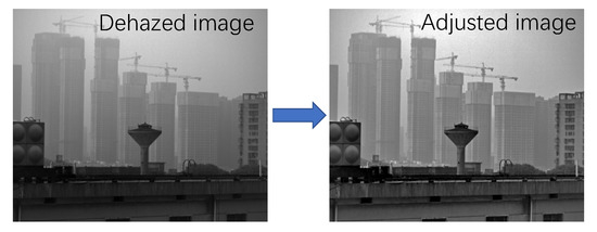 In the hazy background, sunlight irradiates the targets homogeneously after it is scattered by hazy media, and then the camera receives the irradiance attenuated by the haze. As shown in Equations (1)–(4), the longer the distance, the larger is and the more minor is. The scattering light is always white in hazy weather, and the irradiance received by the camera consists of and according to the scattering model, so the value of the pixel will be greater with the increase of the target distance, which means that also can reflect the distance relationship between the targets and the camera. To fuse with conveniently, a similar equation is employed to obtain an image which contains the distance relationship.