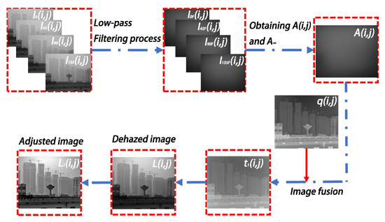 As shown in Equation (4), the transmittance map of the atmosphere is related to the distance between the targets and the camera, and it can be obtained by Equation (6) in the conventional dehazing method. However, the and are estimated by the filtered images, which contain no targets and distance information. To solve this problem, a method is presented in this paper based on image fusion.