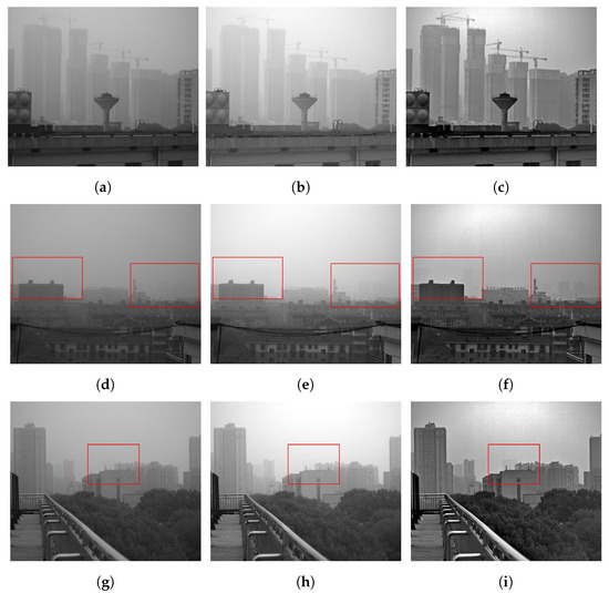 The regions in the red box of Figure 5d–i are enlarged and shown in Figure 6. As shown in Figure 6c,f,i, the details of the dehazed images become richer, and the texture are clearer. There are some buildings obscured by haze in the original image, but they become visible after dehazing. The outlines of far-distance buildings are clearer in Figure 6c,f compared with Figure 6a,d. Moreover, there is a building in the middle part of Figure 6g and it is kept out by haze, but it can be recognized in Figure 6i by our dehazing operation.