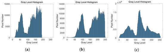 The gray level histogram of the original images and the dehazed images. (a–c) are the gray level histograms of Figure 8a–c, respectively.