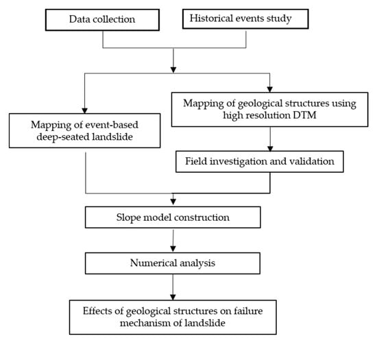 The deep-seated landslide in the Lantai area, I-Lan County, Taiwan has a long history of landslide activity and often damages the I-Lan Special Route 1, which is the sole access road to the Tai-Ping Mountain National Forest Recreation Area. Studies and monitoring of the landslide were conducted since 2015 [15,16,17], and the study in 2018 [18] suggested some ground subsidence implying existence of possible geological structures at the site. This study adopted the high-resolution digital terrain model (DTMH) derived from UAV-mounted LiDAR point cloud data for mapping lineaments of geological structures, and they were then verified through field investigation. We then conducted numerical analysis to study the effects of the geological structures on the failure mechanism of the deep-seated landslide. The geological structures might have significantly affected the failure mechanism of the deep-seated landslide and mitigation facilities. Such results could provide valuable information supporting hazard mitigation strategy. Figure 1 shows a flowchart of the methodology of this study.