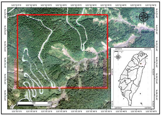 The deep-seated landslide in the Lantai study area situated at the 13.5 km of the I-Lan Special Route 1 in the Tai-Ping Mountain National Forest Recreation Area, Ta-Tung District, I-Lan County, Northeast Taiwan as shown in aerial photograph taken on 27 September 2017 in Figure 2. The study area is enclosed by the red lines, and scars and ground erosion caused by previous landslides are clearly observed in Figure 2. The study area has a long history of landslide activity causing road subsidence, damages of retaining structures, and tilting trees at the site. The terrain of the study area is fairly steep, and the elevation ranges approximately from 1000 to 1200 m above sea level with higher elevation in the west direction sloping toward east direction. The average attitude of the main landslide slope is approximately N29 °E dipping to 30 °E shown in Figure 2.