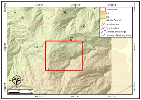 Geological map on the shaded relief of the study area, modified from 1:50,000 Geological Map, Sanshin Plate by Central Geological Survey, 1995 [19]. The Lsc indicates Lushan formation Chingshuihu Member, and the Lsj indicates Lushan Formation Jentse Member (WGS 84 coordinates).