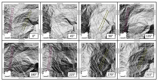 Illustration of the identified lineaments of geological structure using shaded relief map derived from DTMH at eight different azimuth angles: 0°, 45°, 90°, 135°, 180°, 225°, 270°, and 315°, with a light incidence angle of 45° (WGS 84 coordinates). The yellow dash lines marked the lineaments on the main slope face observed at the azimuth angles of 0°, 90°, 270°, and 315°; and purple dash lines marked the lineaments on opposite slope face observed at the azimuth angles of 0°, 135°, 180°, and 225°.