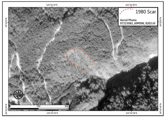 The first aerial photo image record of the deep-seated landslide of the study area taken on 30 November 1980 (WGS 84 coordinates). The bare ground exposed due to landslide is marked with the red dash line, and some vegetation recover can be observed.