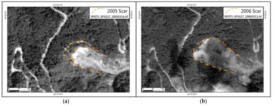 The SPOT5 images acquired on (a) 16th March 2005 before, and (b) 11 March 2006 after the 2005 Typhoon Haitang event. The orange dash line marked the scars and edges of exposed ground caused by landslide (WGS 84 coordinates). The landslide scar in (b) was enlarged and developed further up slope compared to scar in (a).