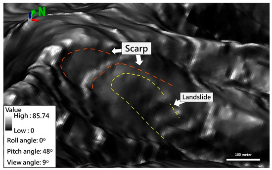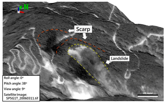The Lantai study area has a long history of deep-seated landslide activities with the first recorded event before 1980. The aerial photograph acquired on 30 November 1980 is the first aerial image record of the landslide as shown in Figure 6. We can observe the bare land exposed due to the landslide before 1980 with dash line marking the edge of the exposed ground, and some vegetation developed after the landslide. A lineament suggesting head scarp can be observed in the up-slope direction of the dashed line just beneath the road. Recurring landslide activities were reported in 2001 by Typhoon Nari, 2005 by Typhoon Haitang, and 2015 by Typhoon Soudelor, and some other smaller events. The events in 2001 and 2015 damaged the road with not so significant scale. Typhoon Haitang hit the Lantai area on 17 July 2005, bringing more than 1000 mm accumulated rainfall, and caused a significant landslide damaging the road and retaining structure severely. The SPOT5 images acquired on 16 March 2005 before and 11 March 2006 after the typhoon event are shown in Figure 7. In the SPOT5 image before typhoon (Figure 7a), the exposed ground can be observed with another scarp developed further up slope. The SPOT5 image after typhoon (Figure 7b) showed a significant enlargement and further development of the exposed landslide scar compared to the image before typhoon. The lineament of the scarp further up slope beneath the road can be observed clearly in both images. Observing the topographic and ground variations especially the head scarp caused by the landslide event in the images, the locations of scarp and landslide could be mapped. The SPOT5 image after the event was overlaid on DTM5 three-dimensionally in Figure 8, which accentuated the topographic variations and lineament of the scarp caused by the landslide. Through inspection from different aspects three-dimensionally, mapping of the scarp and the deep-seated landslide was finalized as shown in Figure 8. The scarps of the landslide appeared to enlarge and develop retrogressively up slope. A new scarp further up slope of the road was observed and mapped. Further validation of the mapped scarp was conducted by overlaying the mapped scarp and SPOT5 image on the slope map derived from DTM5 in Figure 9. It was found that the location of mapped scarps situated where significant topographic variation showing subsidence was, and appeared to consist with the geomorphological characteristics of the deep-seated landslide.