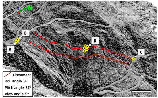 Among different types of landslide hazards, the deep-seated landslide often involves large amount of landslide volume and causes severe hazard and damages to infrastructures [1,2]. Many deep-seated landslides have been reported to recur and evolve into an even larger scale and cause more severe consequences [3,4,5]. When investigating the deep-seated landslide hazard, many researchers found that the local geological settings including characteristics of rock formation and geological structures affect the failure mechanism of a deep-seated landslide significantly [6,7,8]. To properly draft up the mitigation strategy for such deep-seated landslide hazard, it is essential to investigate the related geological setting and structures. This investigation of geological settings is often conducted by ground-based investigation, which is time consuming and expensive, and the results often rely on accessibility of the site and available out-crops of the geological formations and structures. The remote sensing techniques have advanced rapidly in recent years, and remote sensing data have been used by many researchers to analyze topographic characteristics of the deep-seated landslides [9,10]. The light detection and ranging (LiDAR) data, especially, provide terrain details in support of identification of geomorphological features [11,12,13,14]. The high-resolution digital terrain model (DTMH) produced by LiDAR mounted on unmanned aviation vehicle (UAV) provides more detailed topographic variations, which facilitate a good opportunity for identifying the geomorphological features such as lineaments related to the geological structures.