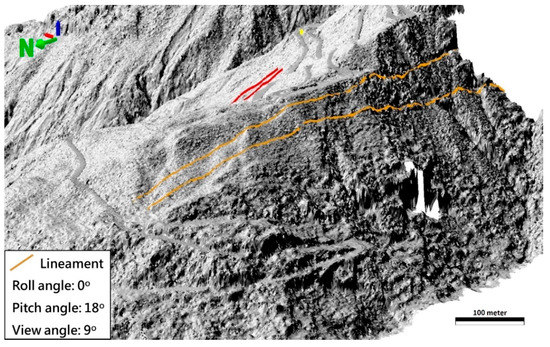 Identification of lineaments of geological structure was conducted using shaded relief map derived from DTMH at eight different azimuth angles as shown in Figure 4. The mapped lineaments were summarized and edited to determine the geological structures. The three-dimensional shaded relief map was then derived with the mapped lineaments and viewed from different angles to identify the topographic subsidence and validation of the mapped geological structure lineaments. The two mapped lineaments on the main slope face could be clearly identified and validated on three-dimensional shaded relief map when viewing from the east direction toward the west direction as marked by the red lines in Figure 10. The two lineaments were approximately 50 m apart, and intersected with the I-Lan Special Route 1 at about 11.4 km on the north side, and at about 13.9 km on the south side. The shaded relief map of the opposite slope behind the ridge was derived and displayed three-dimensionally with the mapped lineaments on opposite slope in Figure 4. The lineaments of geological structures were identified and validated as shown by the orange lines in Figure 11 viewing from west direction toward the east direction. To investigate the extension and attitude of the geological structures in the slope body, the two sets of lineaments on both sides of the ridge were approximated as straight lines and projected on the two-dimensional slope map in Figure 12. It appeared that the set of geological structure lineaments extended from the slope of the main study area through the slope body till reaching the opposite slope. By connecting the two sets of lineaments mapped on opposite slope surfaces of the ridge, the two geological structure surfaces through the slope body were formed. The statues of the two geological structure surfaces were measured taking the shortest distance between the corresponding lineaments on opposite slope surfaces, and the statue of the upper surface was N13 °E dipping 23 °E, while the statue of the lower surface was N20 °E dipping 20 °E, respectively. There was likely a shear zone bounded by the two geological structure surfaces. Such identification would not be possible without DTMH which provided detailed topographic variations.
