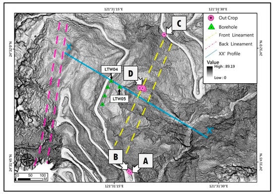 The two sets of lineaments on opposite slope surfaces of the ridge were projected on the planar slope map derived from DTMH using approximate straight lines (WGS 84 coordinates). The field investigation points A, B, C, and D are indicated as pink dots, and green triangles indicate locations of boreholes. The X-X’ profile was used for stability analysis.