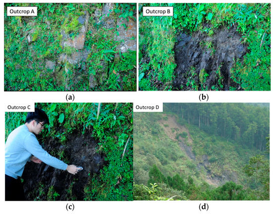 Photographs of out-crops in field: (a) out-crop A, (b) out-crop B with the moist black fault gouge material, (c) out-crop C also showing moist black fault gouge material, and (d) photo taken in October, 2015 after Typhoon Soudelor showing out-crop D with moist black material exposed.