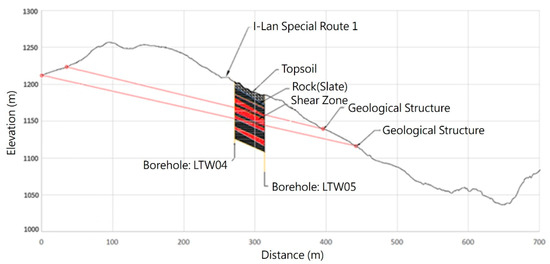 A shear zone bounded by the identified geological structure surfaces was postulated in this study which appeared to be reasonable and was validated by comparing the projected shear zone to the borehole logging data of LTW04 and LTW05 in Figure 14. The logging data displayed the distribution of shear zone materials found in the cores, and the distribution was consistent with the projected shear zone bounded by the geological structures. Furthermore, the identified geological structures and shear zone provided supporting data for interpretation of the drill cores and field data, which provided information on distribution of the ground layers at the site.