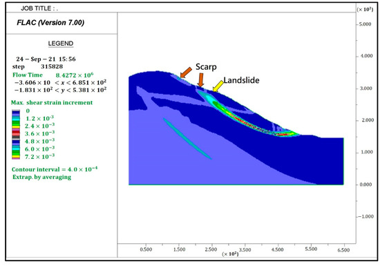 In order to understand whether the existence of the geological structures and shear zone would have affected the failure mechanism of the deep-seated landslide, a separate numerical model analysis was conducted. A slope model similar to the slope model in Figure 15 with the same ground layer, water table, and same material properties but without the shear zone was constructed for the numerical analysis. Figure 19 shows the resulting distribution of the maximum shear strain increment in the slope body. The potential sliding surface indicated by the maximum shear strain increment appeared to develop to a greater depth and formed a larger potential sliding surface. The resulting crest and toe points were also plotted in Figure 18 and marked as state 1. Comparing the sliding surface in Figure 19 to that of the model with the shear zone in Figure 16, it was found that the sliding surface of the model without the shear zone extended to a greater depth and up the slope reaching behind the ridge. The extent of the sliding depth was deeper than distribution of shear zone material in boreholes LTW04 and LTW05 and could not be verified by the borehole data. The crest point of the no shear zone model plotted in Figure 18 located at much further up slope just beyond the ridge, and was beyond the mapped scarp. In addition, no evidence in field and historical records were found to support subsidence at the crest area and related displacements caused by this potential sliding surface. Thus, the proposed slope model with the identified geological structures and shear zone appeared to be a more reasonable model, and provide satisfactory results supported by field evidence, historical records, and borehole data. The failure mechanism of the deep-seated landslide appeared to be significantly affected by the existence of geological structures and shear zone, which were unable to be located without the high-resolution LiDAR derived DTM in the previous study [15,16,17]. The significant differences in the locations of potential sliding surface would affect location and depth of the mitigation facilities severely. Thus, the resulting failure mechanism and location of sliding surface along with the landslide behavior of this study provided vital data for drafting mitigation strategy and design of mitigation facilities.