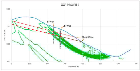The slope profile along profile X-X’ based on DTM5 before the event, showing the borehole loggings of LTW04 and LTW05, with black color indicating rock material (slate), and the red color indicating shear zone material. A shear zone bounded by the two geological structure surfaces was assumed and projected on the profile by red lines.
