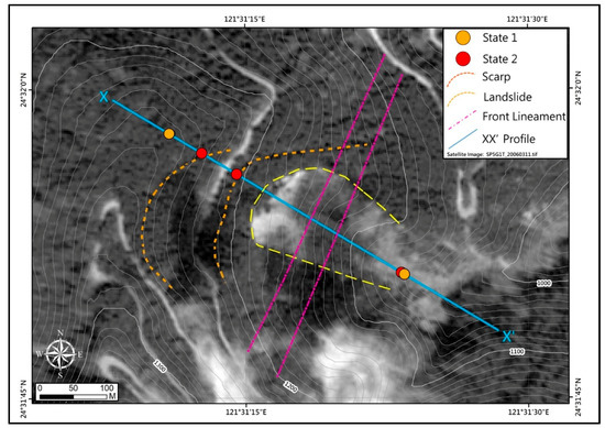 The mapped scarps of SPOT5 image and the crest and toe points of the potential sliding surface resulted from numerical analysis of profile X-X’ (WGS 84 coordinates). Points marked as state 2 indicated results of the slope model with shear zone (with geological structures), and points marked as state 1 indicated results of numerical analysis of slope model without geological structures.