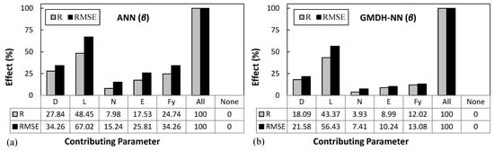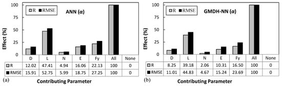 - The sensitivity analysis of the input parameters in the developed ANN and GMDH-NN models for estimating both β and α parameters showed that the calculated SMA bars length (L) variable with higher R and RMSE values is the most influential input variable. Furthermore, the number of SMA bars (N) with lower impact values on the R and RMSE has the least effect.