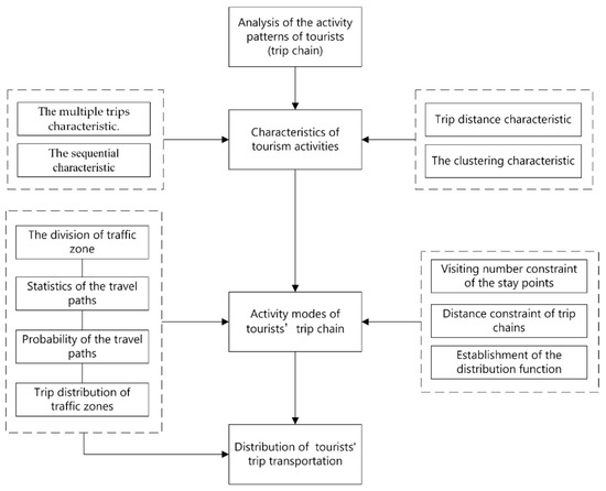 A study area can be divided into multiple traffic zones according to the scenic spots and transportation hubs. These traffic zones can be regarded as stay points in trip chains. Thus, the tourist trip chain becomes chaining of the activities between traffic zones. Then, to predict the spatial distribution of tourists based on the activity modes of the tourists’ trip chain, the first step is to count the number of traffic zones in the tourism city, the next is to clarify the trip chain types and count the number of types according to the statistic of traffic zones and the characteristics of tourists’ trips. Besides, each of the stay points is both the ending point of the last trip and the starting point of a new trip, which implies they would cluster a certain number of tourists. Thus, we can calculate the amount of attraction and production of tourists for each traffic zone. Then, based on the visiting number and trip distance constraints of the stay points, distribution functions could be established to calculate the probability of the type of each trip chain. After that, the trip volume of each trip chain in the traffic zone can be obtained, as well as the volume of trip distributions between each zone. Figure 2 depicts the overall process.