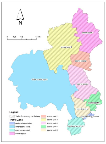 The numbers of tourists in each traffic zone are a precondition of the model. Thus, the number of origin and destination zones should be determined before preparing model input data. The origin zone is the area primarily influenced by transportation hubs, and the destination zone is the area dominated by a scenic spot. Tourist productions or attractions of these traffic zones are important input data of the model.