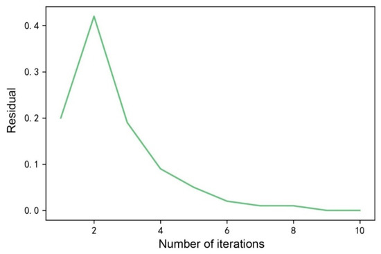 According to the survey of tourists’ trips, this study sets the average number of scenic spots visited by tourists per day no more than two. Then, let ε = 0.05; model parameters γ, , and for this case can be calculated based on Equation (10). Following the steps depicted in Figure 4, after 10 iterations, it can be found that the residual is less than 0.05, and the output γ = −1.7. Figure 6 shows the relation between ε and the number of iterations. Then, based on Equation (10) and the value of and , the values of parameter α and β can be calculated. Because there are two destination zones and seven origin zones, the result values of parameters α and β are = 10.70, = 10.81, = −11.23, = −8.84, = −6.14, = −5.92, = −5.75, = −7.24, = −5.51.