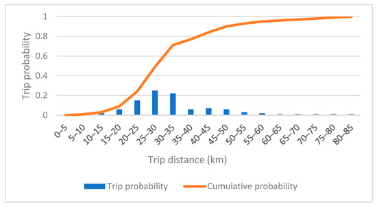 Each trip chain has a certain distance. Thus, we can classify trip chains according to their distance. By counting the number of trip chains at an interval of 5 km, we can obtain the distribution of trip distances and the corresponding trip probability, as listed in Table 5.