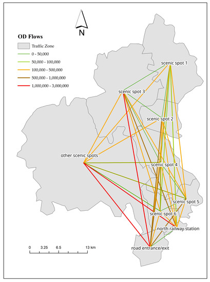 We can draw trip expectation lines (i.e., origin–destination flows of expected trips) based on the trip distribution, as shown in Figure 9. It shows that the volume of trips from the traffic zones based on scenic spot 3 and other scenic spots to the traffic zones based on the north railway station and the road entrances/exits is relatively large, followed by the traffic volume from the traffic zones based on scenic spot 2, 4, and 5 to the traffic zones based on the north railway station and the road entrances/exits. Constrained by the visiting volume of stay points, the trip volume of traffic zones based on transportation hubs is the largest, followed by the trip volume between traffic zones where tourists visit more. These results are consistent with the trip distribution between traffic zones.
