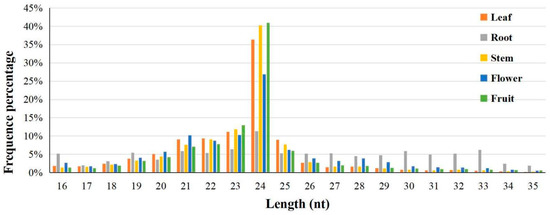To obtain a comprehensive knowledge of the small RNAs in wax gourd, five independent small RNA libraries from leaf, root, stem, flower, and fruit of wax gourd B227 were subjected for high-throughput sequencing. A total of 18,675,941, 20,161,705, 19,947,266, 23,155,945 and 16,085,205 clean reads were generated from leaf, root, stem, flower and fruit of B227, respectively (Table 1). After removing the low-quality reads, 3′ adapter, insert, 5′ adapter, polyA and reads length < 15 nt or > 35 nt, 18,284,736, 19,813,111, 19,551,447, 22,821,341 and 15,843,596 clean tags were respectively obtained from each tissue (Table 1). As shown in Figure 1, the 24 nt long small RNAs were the most abundant small RNAs in all five tissues. Except for root, the length of small RNAs is mainly distributed from 20–25 nt. In the root, the length of small RNAs presented nearly an even distribution from 16–35 nt (Figure 1), implying tissue specificity of small RNAs in wax gourd.