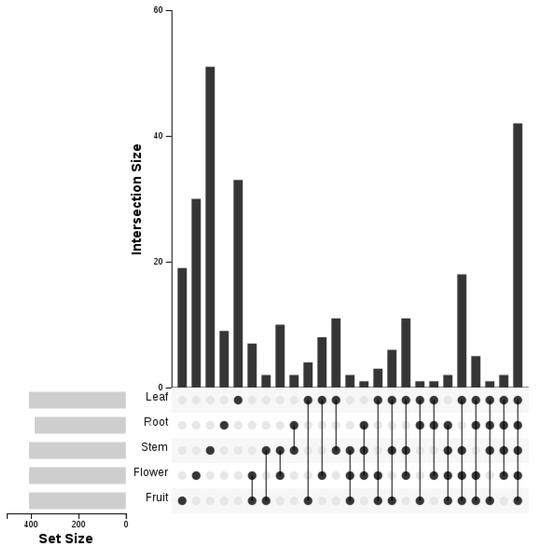 The characteristic hairpin structure of miRNA precursor is an indispensable feature for predicting novel miRNAs [40]. After removing known miRNAs, the remaining sequences were aligned with the wax gourd genome database [33] to discover novel and potential specific miRNAs. Overall, 409 novel miRNAs were identified from five libraries, with 407, 381, 408, 408, and 405 from leaf, root, stem, flower, and fruit, respectively (Table 2). To visualize the expression overlap between novel microRNA sets of each tissue, an UpSet plot was drawn on the Omicshare platform (https://www.omicshare.com/, accessed on 10 October 2021). As shown in Figure 2, there are nearly 20, 30, 55, 10, and 30 novel miRNAs expressed only in fruit, flower, stem, leaf, and root, respectively. More than 40 novel miRNAs were expressed in all the tissues analyzed. All novel miRNAs were successfully aligned to different chromosomes or contigs of wax gourd genome (Supplementary Table S4). The length of novel miRNA mainly ranged from 18 nt to 25 nt, with the 24 nt being the most abundant one, which counted 81.15% among all novel miRNAs (Supplementary Figure S1).