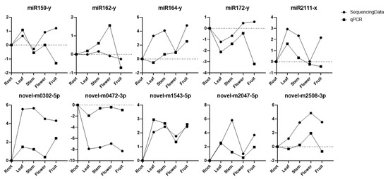 In order to verify the reliability of small RNA sequencing results, qRT-PCR was adopted to detect the relative expression levels of five known and five novel miRNAs in five tissues of wax gourd. It could be concluded that the expression pattern among five tissues using two methods was similar (Figure 3). Thereafter, a correlation analysis was performed between qPCR data and RNA sequencing data. A moderate correlation was found between two methods (R2 = 0.2930, p < 0.0001 ****). The tissue-by-tissue correlation analysis between qPCR and RNA sequencing data was also performed and it was found that the correlation between qPCR and small RNA sequencing of stem and fruit are significant, with p-value 0.007547 and 0.01114, respectively (Table S7). Overall, our qPCR confirmed the reliability and availability of high throughput sequencing results.