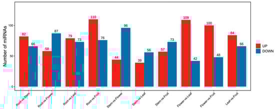 Number of up- and down-expressed miRNAs between tissues. Y-axis represents number of genes and X-axis represents pairwise comparison groups. Up and down expressed miRNAs are presented by red and blue color, respectively.
