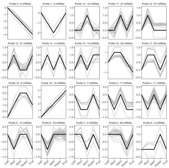 Trend profiles of miRNAs with similar expression pattern. In total, 20 trend profiles were generated. Y-axis represents the expression level of miRNAs among five tissues by resequencing data and X-axis represents five tissues.