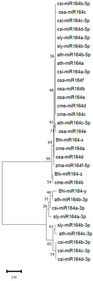 To understand the relationship between wax gourd miR164 and miR164 from other plant species. The miR164 from Citrus sinensis, Sonanum lycopersicum, Arabidopsis thaliana, Cucumis melo, and Oryza sativa were downloaded from miRbase (www.mirbase.org, accessed on 19 October 2021) and the miR164-x, miR164-y, and miR164-z were also included for neighbor-joining (NJ) tree build using MEGA 11 software. It can be seen that most of miR164 among plant species are conserved and miR164-x of wax gourd was the same as that of miR164a of melon and miR164d of rice (Figure 7).