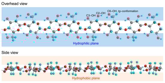 Hydrophilic and hydrophobic planes of cellulose marked with the primary C6-OH (with tg-conformation corresponding cellulose I crystalline structure), and secondary C2-OH and C3-OH groups in glucosyl unit. Reprinted with permission from [37].