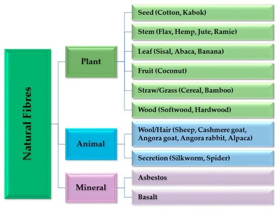 Natural fibres are divided into three categories: plant fibres, animal fibres and mineral fibres (Figure 5). Plant fibres are the most used in conventional composite processing only as a reinforcement. All plant fibres contain cellulose, while animal fibres are made from proteins [136].