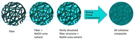 There are two main ways to produce ACCs [102,170,171,172,173]. The first method is the one-step method. It is based on the partial dissolution of cellulosic materials, where the same raw material is used to create both reinforcement and matrix (Figure 6) [6,14]. This type of composite can also be called a self-reinforcing composite [172]. Here, the chosen cellulose solvent system will partially dissolve the surface or weaker regions of the reinforcement fibres, and the dissolved cellulose will form a matrix surrounding the initial fibre structure during its precipitation. Meanwhile, the core of the reinforcing fibres maintains its original structure and chemical crystallinity, which has a reinforcing effect on the composite [131]. One of the great benefits of this approach is that interfaceless composites can be prepared where the boundaries between reinforcement and matrix are indefinite between the phases [14]. In addition, the undissolved fibre content of the composite can easily be controlled by changing the dissolution time [102].