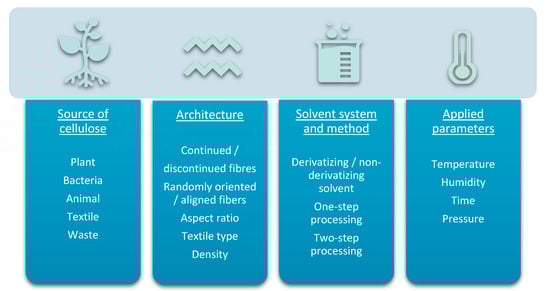 Many of the process variables in ACC production, such as temperature, humidity, pressure and dissolution time depend on chosen solvent system. Generally, the strength of the fibres increases with increasing moisture content and decreases as temperature increases [186]. When producing ACC-based aerogels, a major influential factor is the drying method—freeze-drying, CO2 drying or vacuum drying—since it determines the resulting morphology of the ACC [187]. Adak and Mukhopadhyay [185] have researched the effect of applied pressure on the structure and properties of ACCs. According to the study application of pressure during composite manufacturing, controlled shrinkage and void formation and improved adhesion. This significantly contributed to better tensile and flexural properties of ACC laminates. In another study related to pressure, the elongation at break of cotton fabricated ACC decreased and the tensile modulus increased with increasing pressure of hot press. In the same study on hinoki lumber based ACC, a diverse outcome was obtained: applying 10 MPa and 5 MPa pressure gave higher tensile modulus than when applying a pressure of 15 MPa. The decrease in tensile modulus at 15 MPa can be related to observed cracks in formed composite [188].