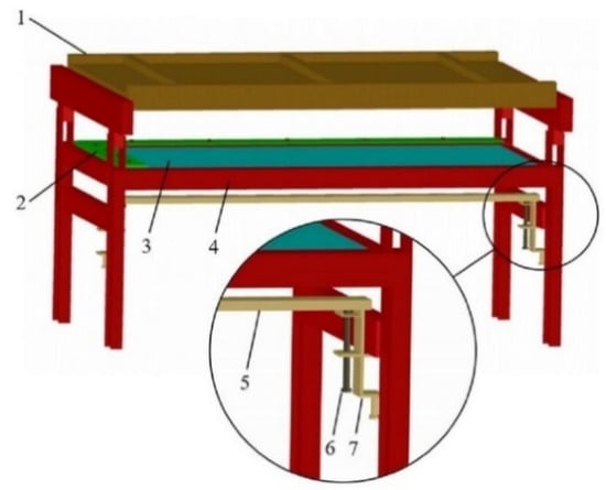 Test device. The symbols in the figure are as follows: (1) Reaction frame, (2) Fixed steel plates, (3) Glass, (4) Support frame, (5) Square steel pipe, (6) Screw, (7) Fixed buckle.