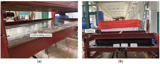 Following the cold-bending tests, the uniform load tests were performed. For this, 2 wedge-shaped inclined braces were placed between the support frame and the 2 free edges of the glass panel to make sure the panel remained cold-bent with the 4 edges of the frame being supported. Subsequently, a gasbag was installed between the reaction frame and the glass panel. To simulate the wind load, a uniform load was applied to the glass panel by the gasbag and a gas pump. The uniform load tests are shown in Figure 3b. According to [20], the wind load is 5 kPa when the wind load resistance of the exterior window reaches the highest level. Based on this idea, the uniform load was divided into 5 levels (each at 1 kPa) and maintained for 15 min. The load was measured by the barometer on the gas pump.