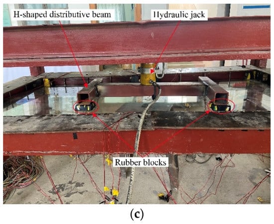 The ultimate capacity tests started 24 h after the uniform load tests ended. Since the loading capacity of the gasbag is limited, the glass panel cannot be loaded to failure, so a hydraulic jack and an H-shaped distributive beam were used as the loading devices in the ultimate capacity tests. Firstly, after the gasbag was removed, the hydraulic jack and the distributive beam were placed at the center of the glass panel for 4-point loading. The ultimate capacity tests are shown in Figure 3c. To avoid direct contact between the glass panel and the distributive beam, 4 rubber blocks were located under the 4 corners of the distributive beam. The self-weight of the loading devices and rubber blocks were taken as the load of the first level (0.6 kN). Subsequently, the glass panel was loaded with step loads. Each step was as large as 1 kN and was maintained for 15 min. When the glass panel failed, the ultimate capacity tests would end, and the loading values would be measured by the digital pressure gauge on the hydraulic jack.