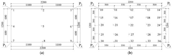 Strain gauges were attached on the upper and lower surfaces of the glass panel to obtain the stress distribution on the surface of the glass panel during the tests. Through these gauges, strain data could be automatically and accurately recorded and monitored by the static strain test system mentioned above. The upper surface of the glass panel, where 9 strain gauges (S1–S9) are attached, was subjected primarily to compressive stress during the tests. Meanwhile, the lower surface, where 25 strain gauges (S10–S34) are located, was mainly subject to tensile stress. Since the bearing capacity of glass panels is primarily dependent on the maximum tensile strength, more testing points were assigned on the lower surface. The direction of the principal stress was uncertain, so right-angle strain rosettes were adopted at all stress testing points. The linear strains of the 3 directions of each right-angle strain rosette were collected by the static strain test system. Then, the static strain test system automatically calculated the first main stress and the second main stress of each testing point, and the maximum of the 2 was the maximum principal stress of each testing point. The arrangements of the strain gauges are shown in Figure 4a,b. Additionally, 9 displacement testing points were arranged on the lower surface of the glass panel to monitor the displacement changes in the key positions of the glass panel during the tests. The distribution of these testing points is depicted in Figure 4c. The strain-type displacement sensors were installed on these displacement testing points to measure the displacement, and the displacement data were recorded and monitored by the static strain test system.