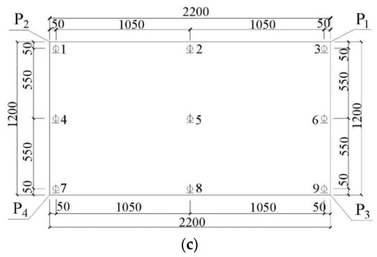 Arrangement of the testing points. (a) Strain rosettes on the upper surface; (b) Strain rosettes on the lower surface; (c) Displacement testing points.